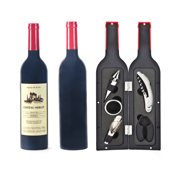 מארז אביזרי יין במעמד בצורת בקבוק.