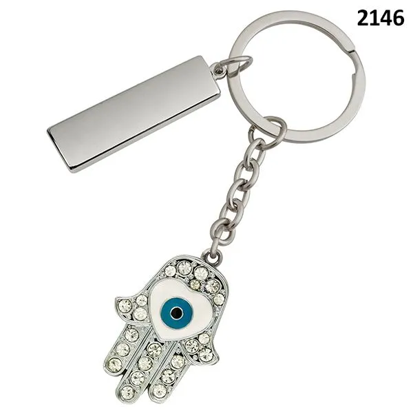 מחזיק מפתחות מתכתי משובץ באבנים "חמסה" עם לוחית מלבנית למיתוג