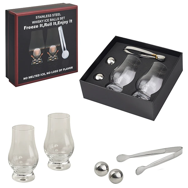 סט מתנה ויסקי - שתי כוסות עם כדורי קרח ממתכת
