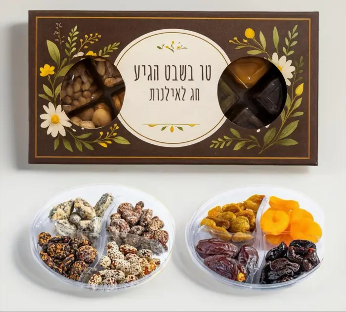 מארז 2 מגשים עם 8 סוגי פירות יבשים ופיצוחים כ 1 קילו